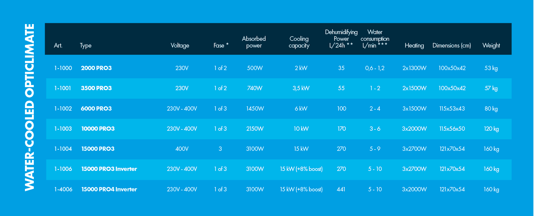 OptiClimate 2000 PRO3. The OptiClimate 2000 PRO 3 water-cooled air conditioner for perfect climate control has a cooling capacity of 2kW. This new OptiClimate 2000 PRO 3 is specially designed for small spaces.